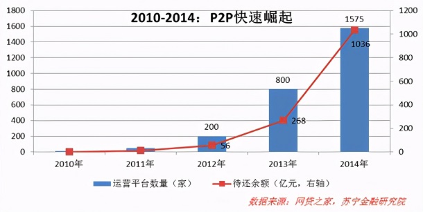 至此,P2P的市場環(huán)境才趨向成熟了,在互聯(lián)網(wǎng)金融的大旗下,P2P的發(fā)展步入快車道。截止2014年末,運營平臺1575家,待還余額超過千億。