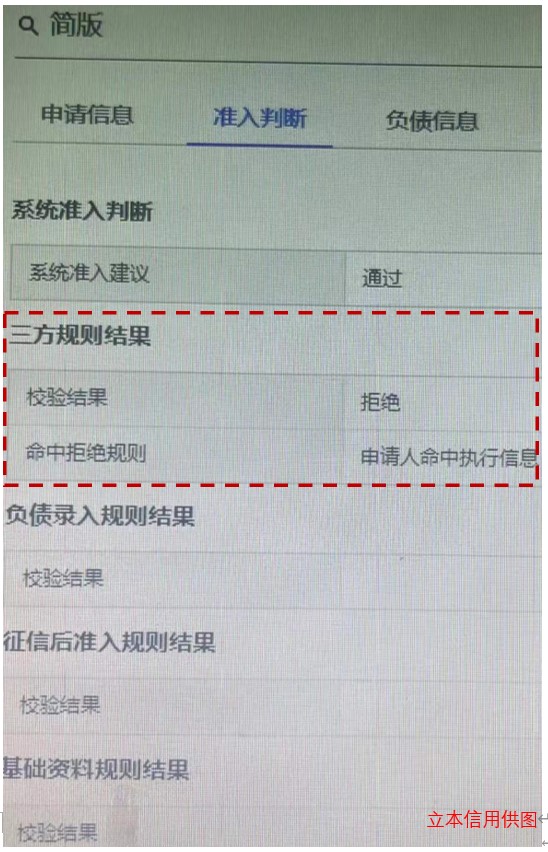 最近銀行信貸領(lǐng)域瘋狂在傳的兩張截圖,一張是貸款申請人因為“命中執(zhí)行”被拒絕貸款的截圖,一張是銀行大數(shù)據(jù)風(fēng)控系統(tǒng)司法風(fēng)險篩查的截圖。這進一步證明了,我國司法大數(shù)據(jù)全面接入了金融系統(tǒng)、應(yīng)用于信貸風(fēng)控,包括裁判文書、被執(zhí)行人、失信被執(zhí)行、限高、終本案件,以及司法訴訟過程流程中的開庭公告、立案信息等。